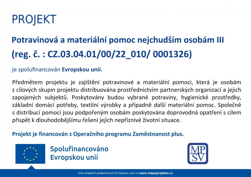 Projekt pomáhá lidem v tíživých sociálních situacích tím, že jim umožňuje překlenout těžké životní období poskytováním potravinové či materiální pomoci a současně je prostřednictvím vhodných doprovodných vhodně směřuje a motivuje k dlouhodobějšímu řešení jejich problémů, tedy k řešení příčin jejich obtížné životní situace. Tímto projektem zajišťuje Ministerstvo práce a sociálních věcí ČR distribuci základních potravin, hygienických potřeb, základních domácích potřeb a některých textilních výrobků nejchudším občanům ČR. Probíhá též distribuce stanů, spacáků a karimatek pro řešení nouzových situací osob bez domova a distribuce školních pomůcek pro děti z rodin ve vážné sociální nouzi.