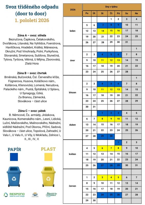 Město Slavkov u Brna informuje občany o svozu tříděného odpadu systémem door to door v 1. pololetí roku 2026. Plasty (včetně nápojových kartonů a kovů) a papír jsou sváženy přímo od rodinných domů podle svozových zón A, B a C, které mají stanovené pevné svozové dny v týdnu. Přehled ulic zařazených do jednotlivých zón a konkrétní termíny svozu jsou uvedeny ve svozovém kalendáři níže. Žádáme občany, aby nádoby ke svozu přistavovali včas a respektovali uvedený harmonogram.