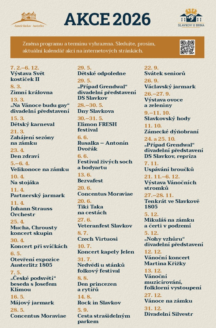 Program sezony přinese řadu oblíbených akcí, například Velikonoce na zámku, Májový jarmark nebo tradiční Dny Slavkova, jejichž součástí bude také populární gastronomický Prima FRESH festival. Návštěvníci se mohou těšit i na operu Rusalka, Festival živých soch a bodyartu, koncert kapely Jelen, festival Nedvědi u stánků, Rock in Slavkov nebo Veteranfest Slavkov. Celkem se na zámku během roku uskuteční více než padesát akcí pro návštěvníky všech generací.